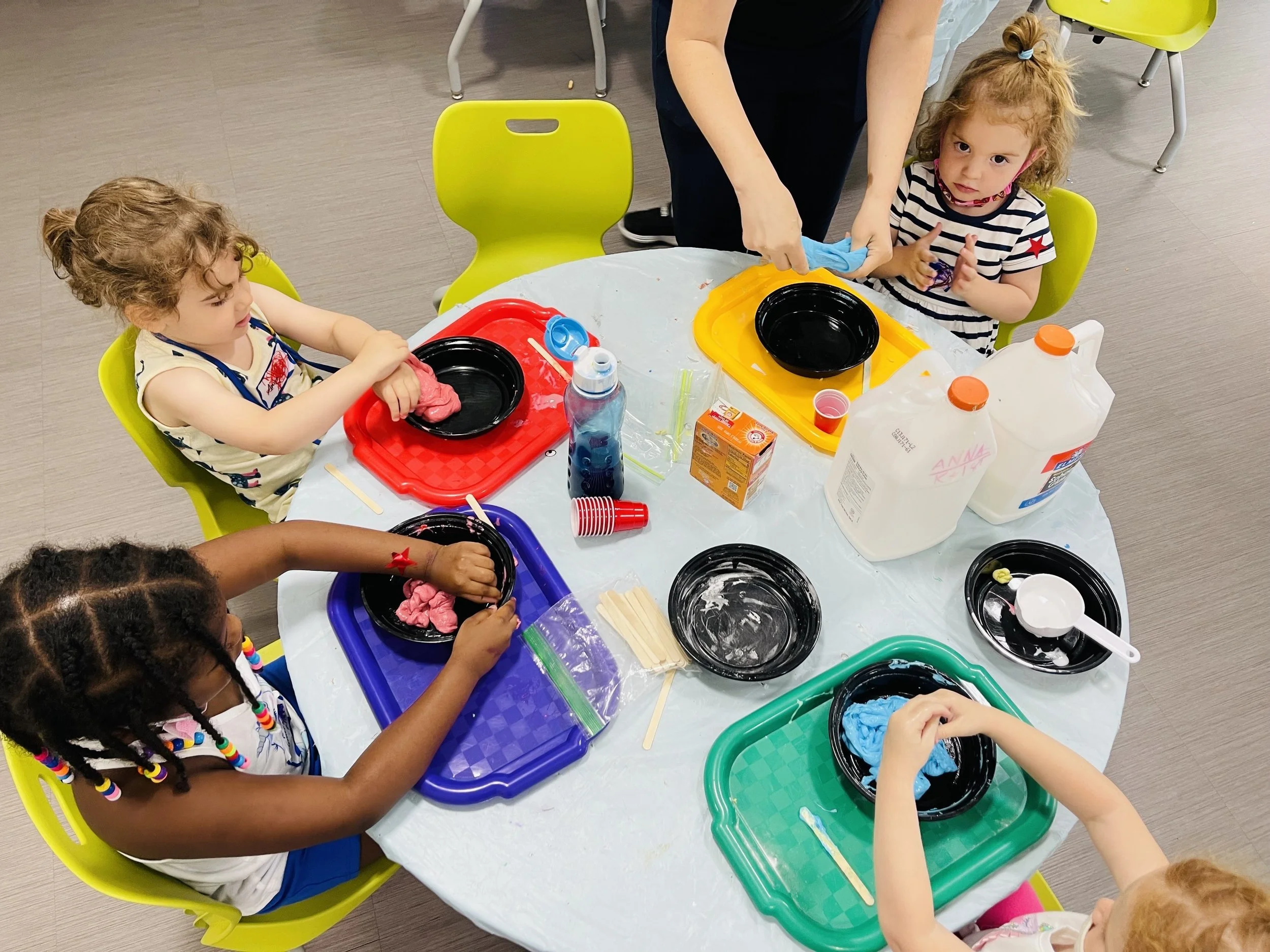 We’ll set up 4 stations based on a seasonal theme like Spooky Splat in October (spider web slime, spider puppets, orange and black cup towers, ghost drawings), Valentines Day (red salt dough, valentine crowns, engineering challenge, heart pipecleaner puppets)